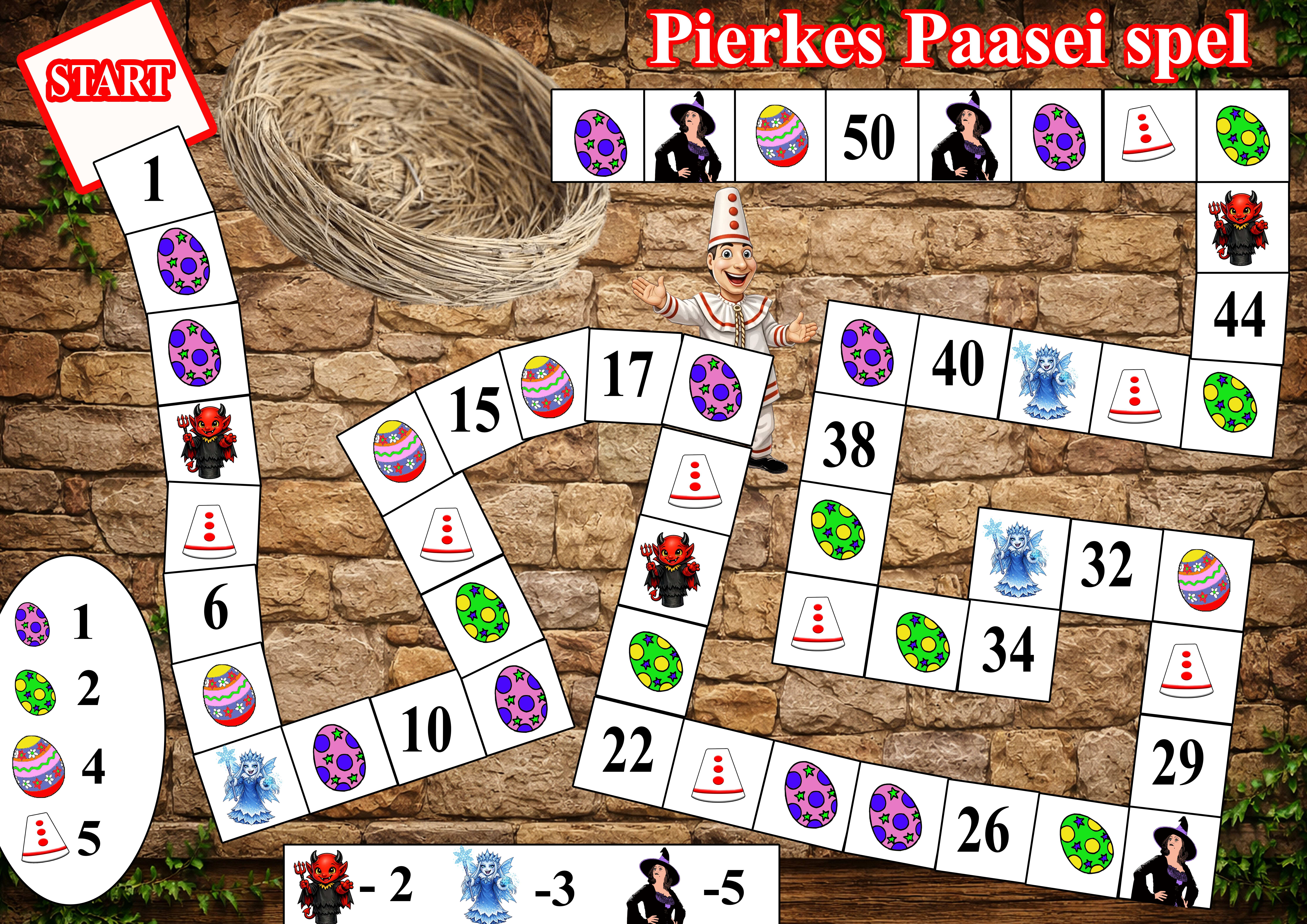 Download het vrolijke paasei-spel van Pierke als handige PDF. Je ontvangt zowel het spelbord als de spelregels, klaar om thuis te printen. Knip het spelbord eventueel uit en leg het op tafel of plak het op karton voor extra stevigheid. Iedereen kiest een pion (of klein voorwerp) en zet die op start.