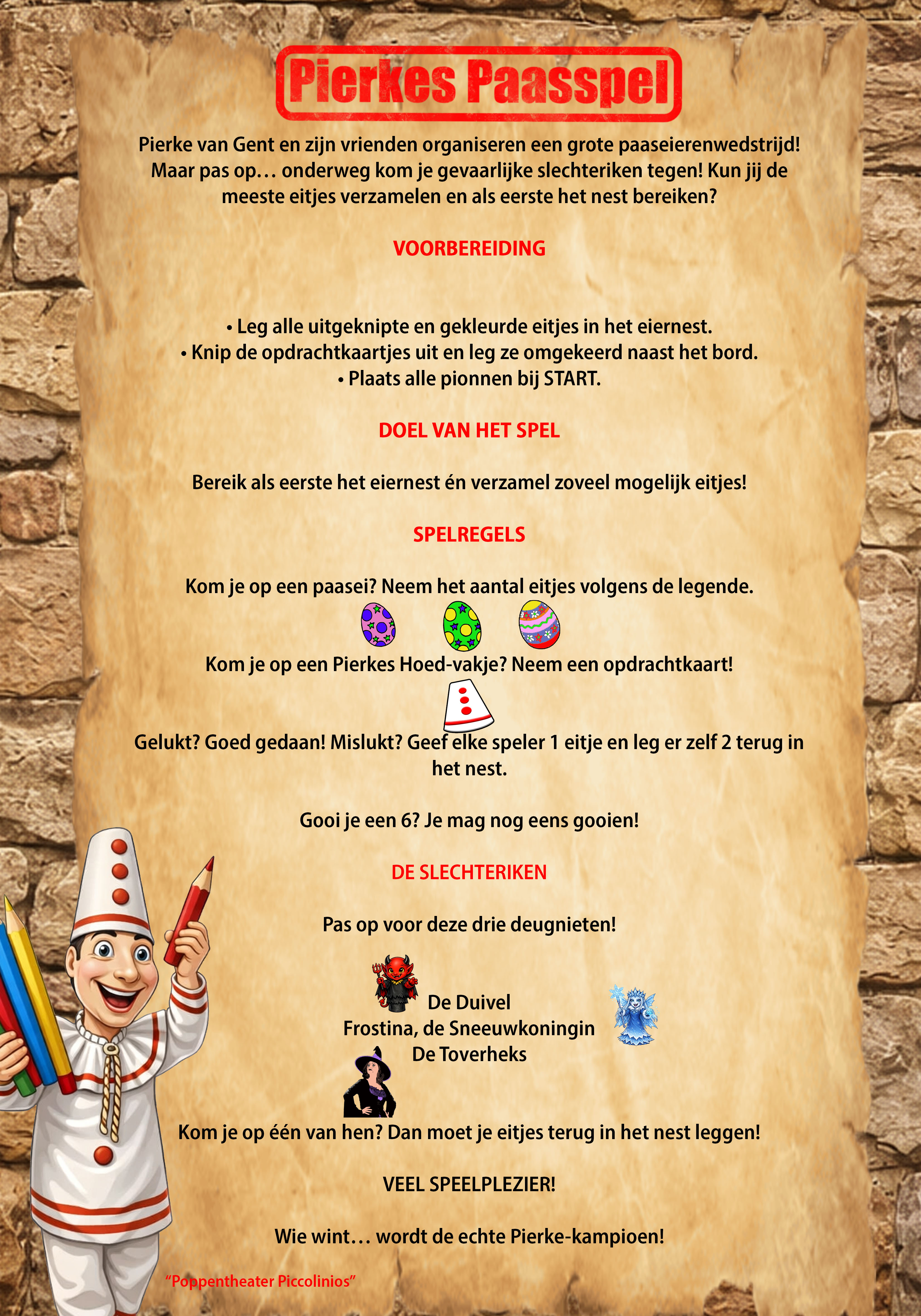 Welkom op de downloadpagina van het paasei-spel van Pierke van Gent! In dit paasei-spel gaan jullie samen op avontuur, gooien jullie met de dobbelsteen en voeren jullie leuke, eenvoudige opdrachtjes uit. Het spel is ideaal om met het hele gezin te spelen tijdens Pasen: makkelijk te begrijpen voor jonge kinderen, maar ook leuk voor oudere broertjes, zusjes en (groot)ouders. Het paasei-spel is helemaal gratis te downloaden, zodat iedereen mee kan doen. Print de spelmaterialen uit, verzamel wat paaseitjes en beleef samen een gezellige, actieve paasvoormiddag of -namiddag vol lachen, zoeken, dobbelen en natuurlijk: paaseitjes rapen!